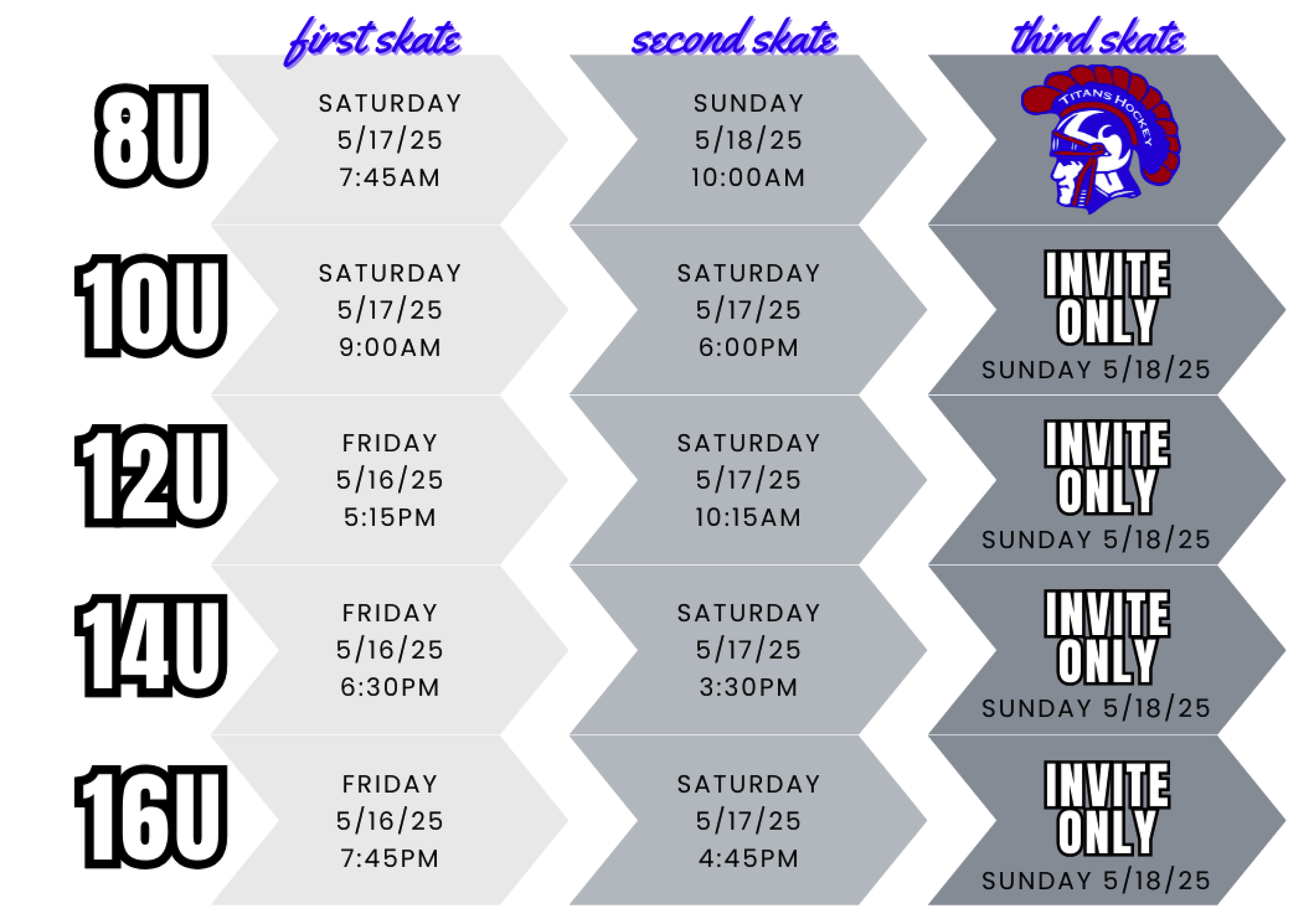 Email notifications for invite only skates will be sent later in the day following the second skate for each age group (except 8U). Notifications will be sent to the email addresses included in your player's registration.