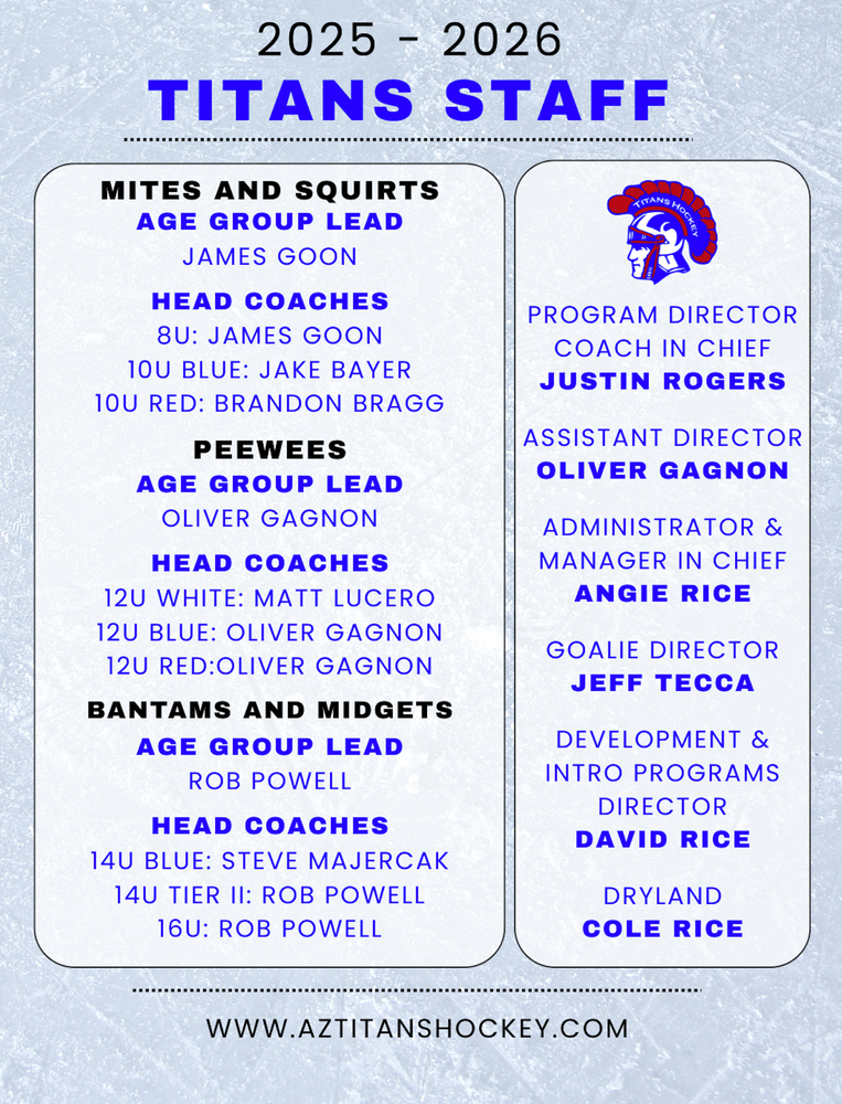 We are thrilled to announce the 2025 - 2026 VOSHA Titans staff and coaches. Together, their extensive experience includes youth, AAA, Juniors, D2 and pro hockey levels. We are excited to start our 8th season of Titans travel with this amazing group of leaders and cannot wait to be back on the ice for a fresh new season.